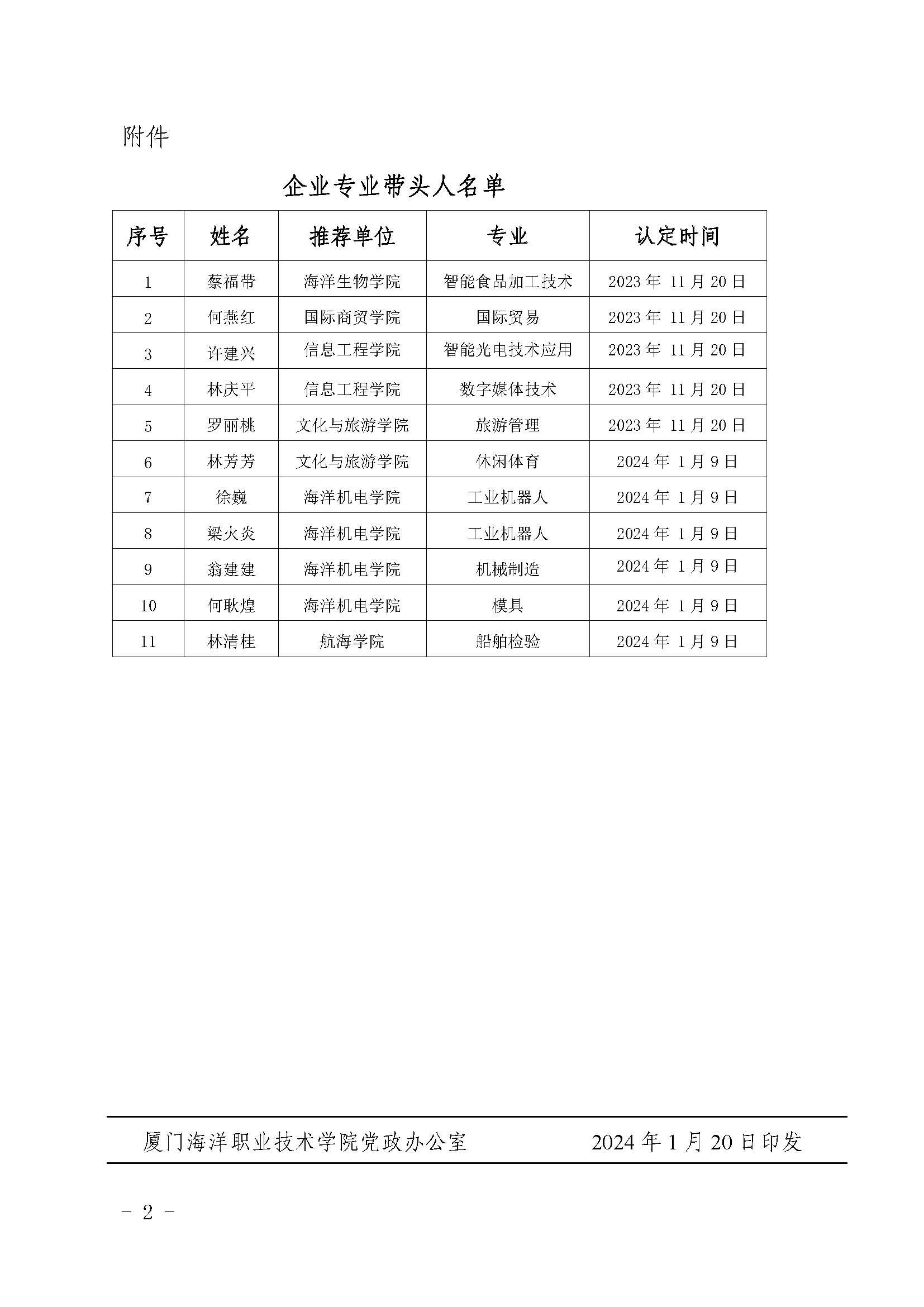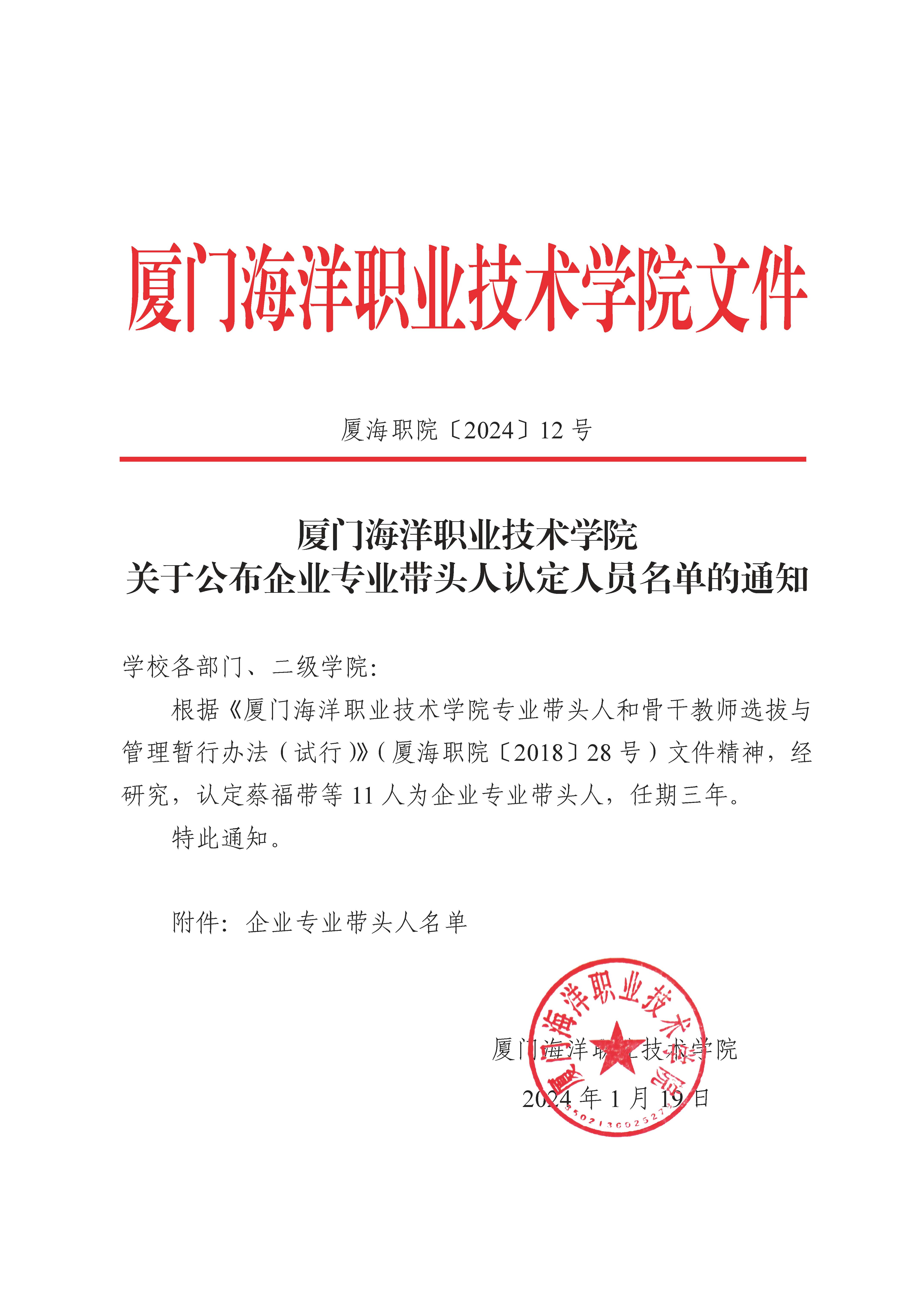 1月19日,廈門海洋職業(yè)技術(shù)學(xué)院公布企業(yè)專業(yè)帶頭人認(rèn)定人員名單的通知,根據(jù)《廈門海洋職業(yè)技術(shù)學(xué)院專業(yè)帶頭人和骨干教師選拔與管理暫行辦法(試行)》(廈海職院〔2018〕28號(hào))文件精神,認(rèn)定鳳凰創(chuàng)壹董事長林慶平等11人為企業(yè)專業(yè)帶頭人,任期三年。