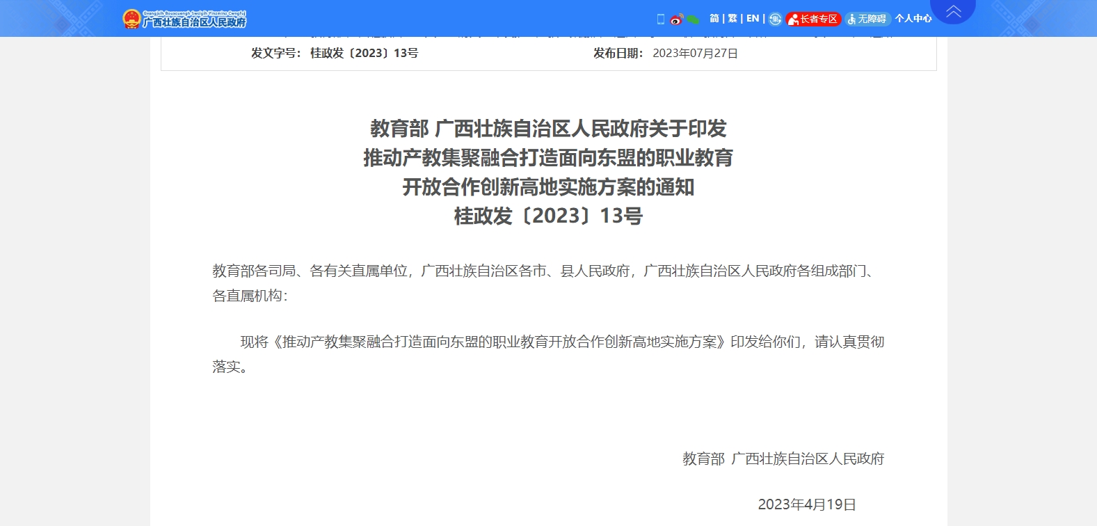 教育部 廣西壯族自治區(qū)人民政府關(guān)于印發(fā)推動(dòng)產(chǎn)教集聚融合打造面向東盟的職業(yè)教育開放合作創(chuàng)新高地實(shí)施方案的通知桂政發(fā)〔2023〕13號