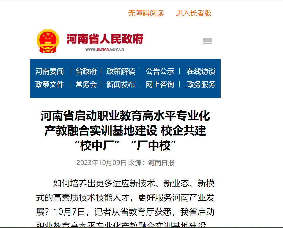 10月7日,記者從省教育廳獲悉,河南省啟動(dòng)職業(yè)教育高水平專業(yè)化產(chǎn)教融合實(shí)訓(xùn)基地建設(shè),以進(jìn)一步推動(dòng)學(xué)校人才培養(yǎng)與企業(yè)用人需求精準(zhǔn)匹配,形成產(chǎn)教融合新生態(tài)。