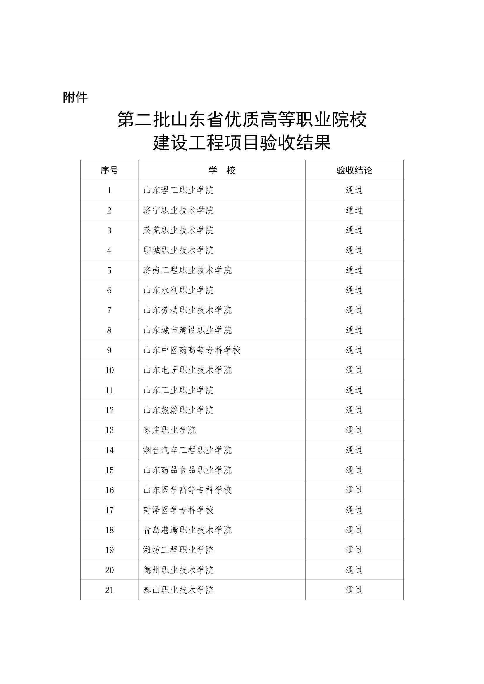 根據(jù)山東省優(yōu)質(zhì)高等職業(yè)院校建設(shè)工程實施管理規(guī)定,在學(xué)校自評、項目審計基礎(chǔ)上,我廳組織專家采取現(xiàn)場評估方式,對第二批立項建設(shè)的省優(yōu)質(zhì)高職院校進行了驗收。按照《山東省教育廳 山東省財政廳關(guān)于實施山東省優(yōu)質(zhì)高等職業(yè)院校建設(shè)工程的通知》(魯教職字〔2017〕4號)相關(guān)規(guī)定,依據(jù)專家驗收結(jié)果,21所立項建設(shè)的第二批省優(yōu)質(zhì)高職院校全部驗收通過,授予“山東省優(yōu)質(zhì)高等職業(yè)院?!狈Q號。驗收結(jié)果經(jīng)公示無異議,現(xiàn)予以公布(見附件)。