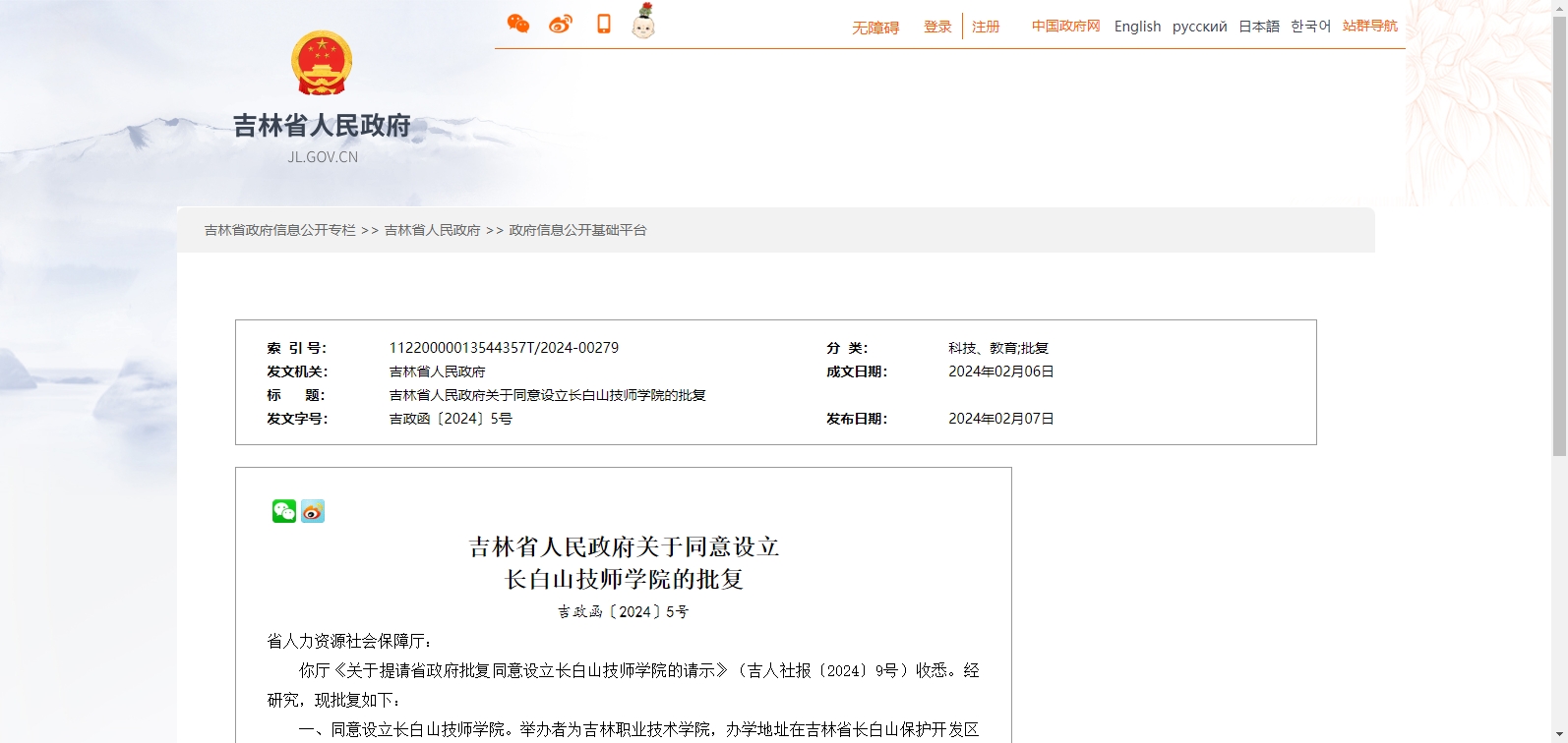 你廳《關于提請省政府批復同意設立長白山技師學院的請示》(吉人社報〔2024〕9號)收悉。經研究,現批復如下: