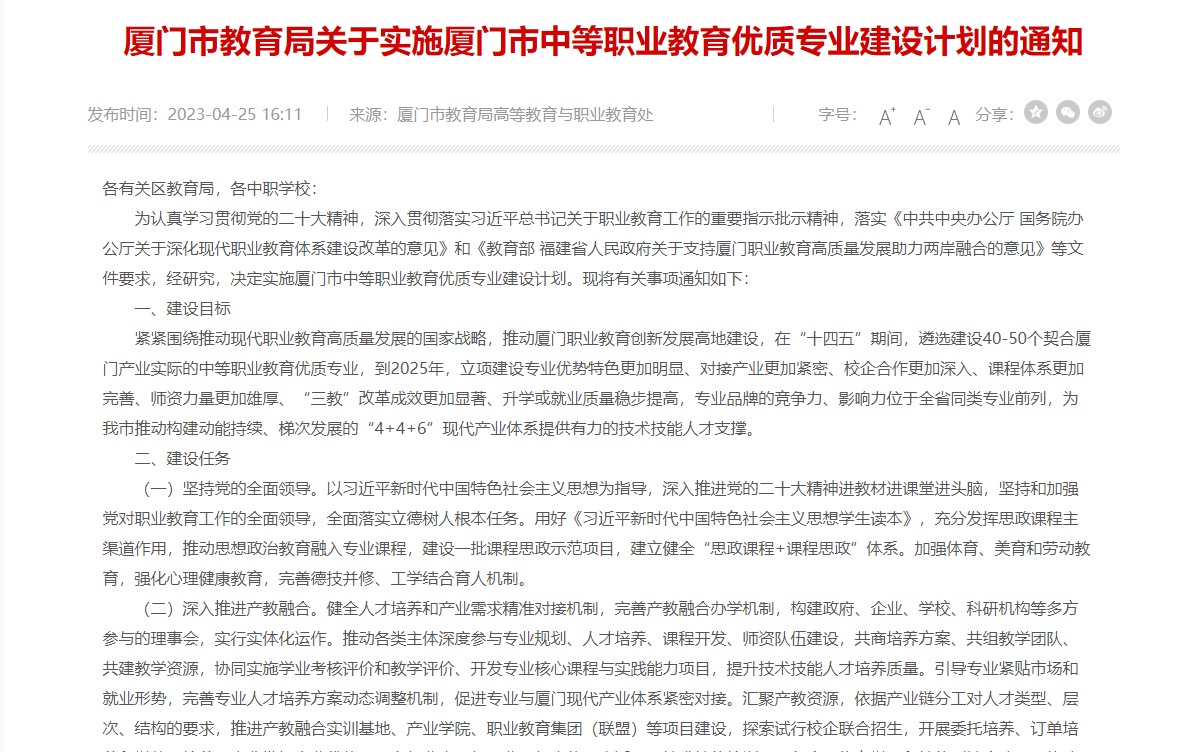 近日,廈門(mén)市教育局發(fā)布關(guān)于實(shí)施廈門(mén)市中等職業(yè)教育優(yōu)質(zhì)專(zhuān)業(yè)建設(shè)計(jì)劃的通知,緊緊圍繞推動(dòng)現(xiàn)代職業(yè)教育高質(zhì)量發(fā)展的國(guó)家戰(zhàn)略,推動(dòng)廈門(mén)職業(yè)教育創(chuàng)新發(fā)展高地建設(shè),在“十四五”期間,遴選建設(shè)40-50個(gè)契合廈門(mén)產(chǎn)......