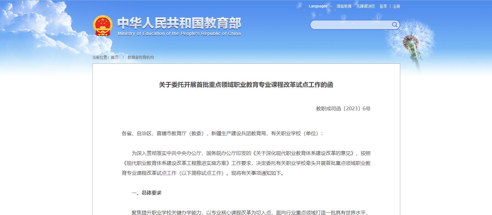 教育部職成司發(fā)布關(guān)于委托開展首批重點領(lǐng)域職業(yè)教育專業(yè)課程改革試點工作的函