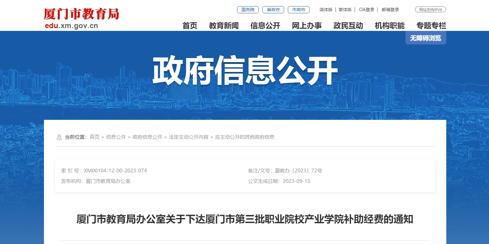 廈門(mén)市教育局發(fā)布下達(dá)廈門(mén)市第三批職業(yè)院校產(chǎn)業(yè)學(xué)院補(bǔ)助經(jīng)費(fèi)通知